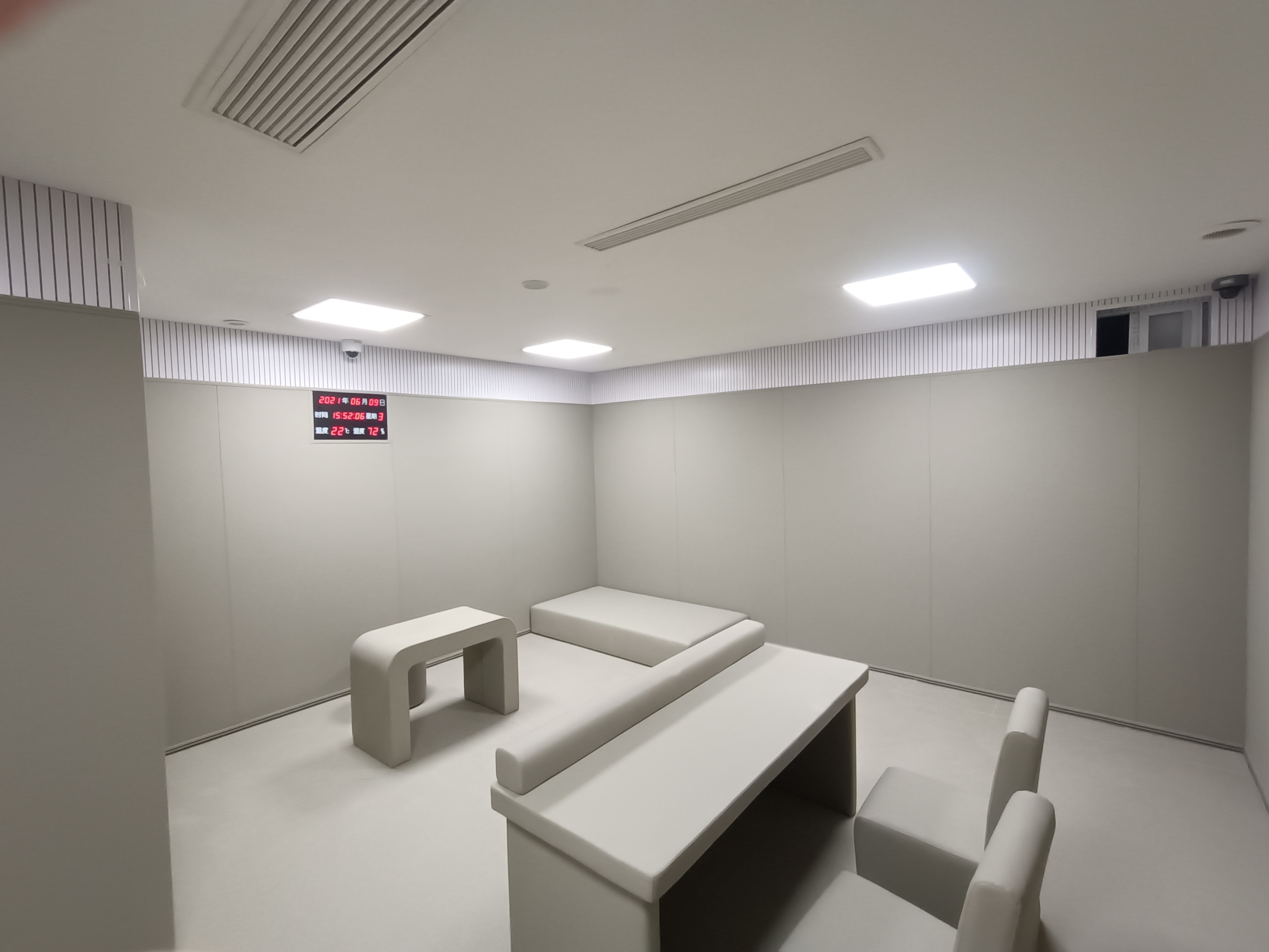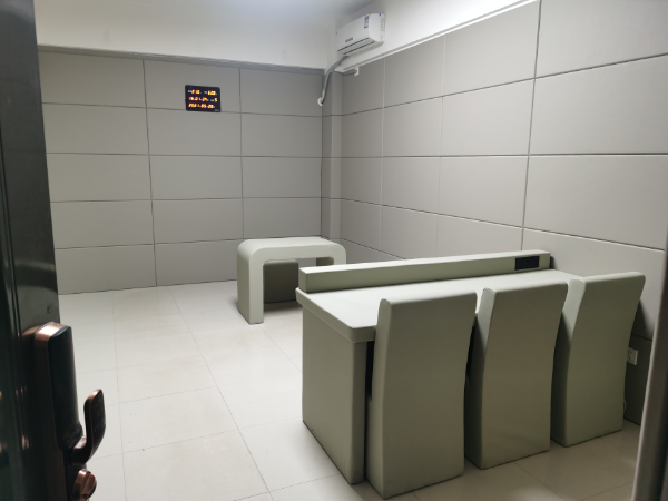 (1)為防止因被審訊(訊問)人因發(fā)生碰撞而造成意外,審訊臺審訊椅都要進(jìn)行軟包或圓角處理,不能有尖銳突出角。