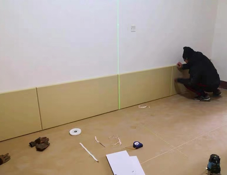7、防撞門的安裝:將軟包裁剪成跟門相對應尺寸,組裝門邊線,將門邊線裁剪好相應尺寸,將軟包粘貼到門上面,用配套的門邊線收邊,在門的正反兩面安裝一個軟質門拉手。